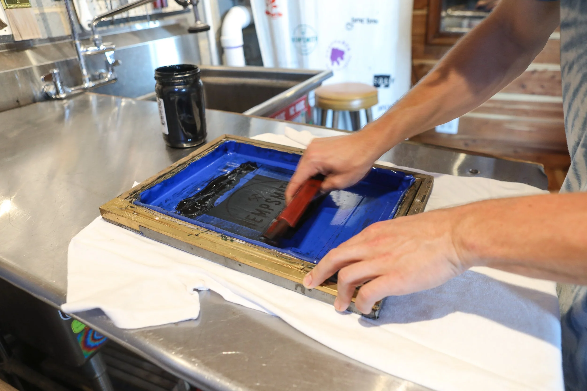 Every shirt is tied by hand before dyeing. Each design is screen printed one layer at a time. Our dyes are mixed in small batches, and our shop sink doubles as our dye house.